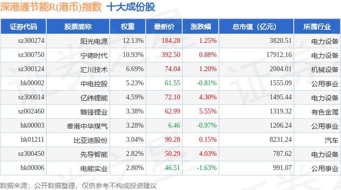 深港通节能R(港币)(483086)指数十大成份股详情如下: