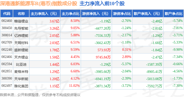 资金流向方面,深港通新能源车R(港币)(483088)指数成份股当日主力资金净流入合计20.62亿元,游资资金净流出合计2.26亿元,散户资金净流出合计18.36亿元。成份股资金流向详情见下表: