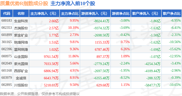 资金流向方面,质量优势R(489017)指数成份股当日主力资金净流入合计5.8亿元,游资资金净流入合计1.14亿元,散户资金净流出合计6.94亿元。成份股资金流向详情见下表: