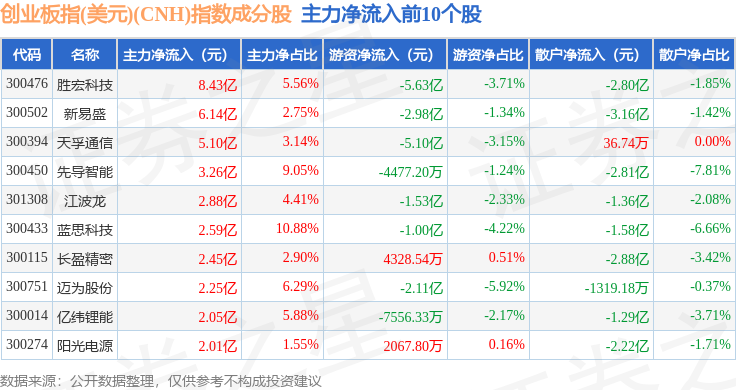 资金流向方面,创业板指(美元)(CNH)(970007)指数成份股当日主力资金净流入合计39.15亿元,游资资金净流出合计12.13亿元,散户资金净流出合计27.03亿元。成份股资金流向详情见下表: