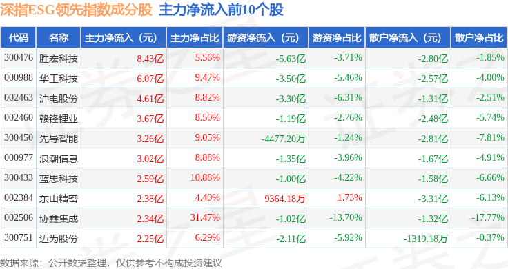 资金流向方面,深指ESG领先(970029)指数成份股当日主力资金净流入合计32.37亿元,游资资金净流出合计15.5亿元,散户资金净流出合计16.87亿元。成份股资金流向详情见下表: