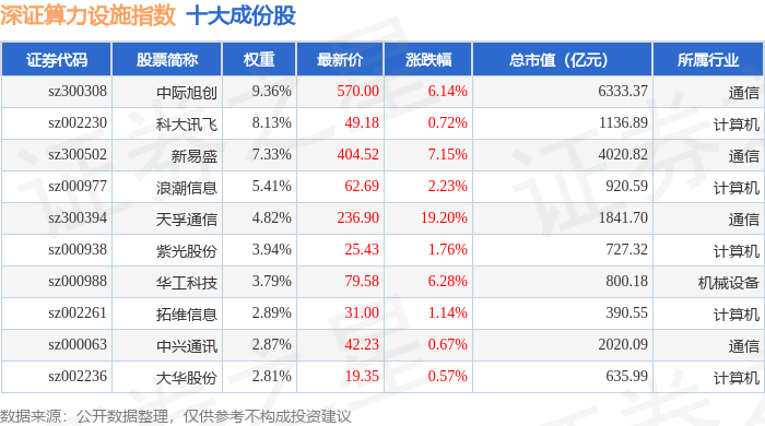 证券之星消息,12月8日,深证算力设施(970051)指数报收于11764.48点,涨4.53%,成交1378.18亿元,换手率3.32%。当日该指数成份股中,上涨的有45家,致尚科技以20.0%的涨幅领涨,下跌的有4家,航宇微以2.63%的跌幅领跌。