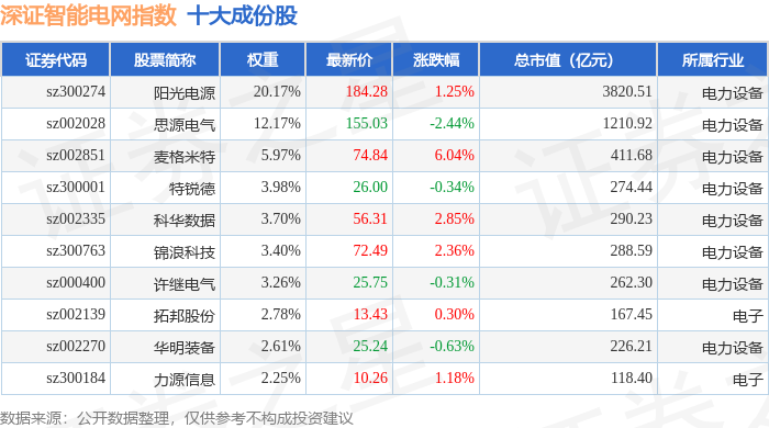 证券之星消息,12月8日,深证智能电网(970054)指数报收于3920.55点,涨0.68%,成交302.21亿元,换手率2.85%。当日该指数成份股中,上涨的有37家,麦格米特以6.04%的涨幅领涨,下跌的有12家,思源电气以2.44%的跌幅领跌。