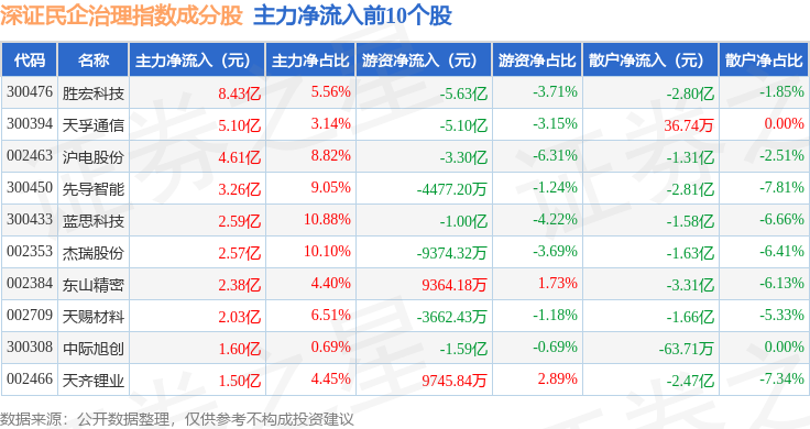 资金流向方面,深证民企治理(970058)指数成份股当日主力资金净流入合计33.46亿元,游资资金净流出合计15.49亿元,散户资金净流出合计17.97亿元。成份股资金流向详情见下表: