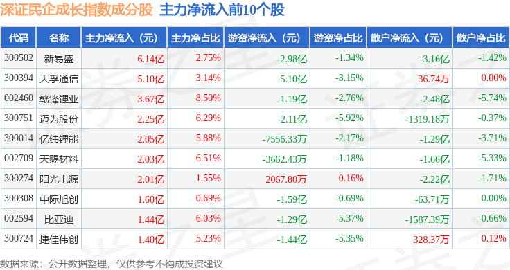 资金流向方面,深证民企成长(970071)指数成份股当日主力资金净流入合计31.47亿元,游资资金净流出合计14.16亿元,散户资金净流出合计17.31亿元。成份股资金流向详情见下表: