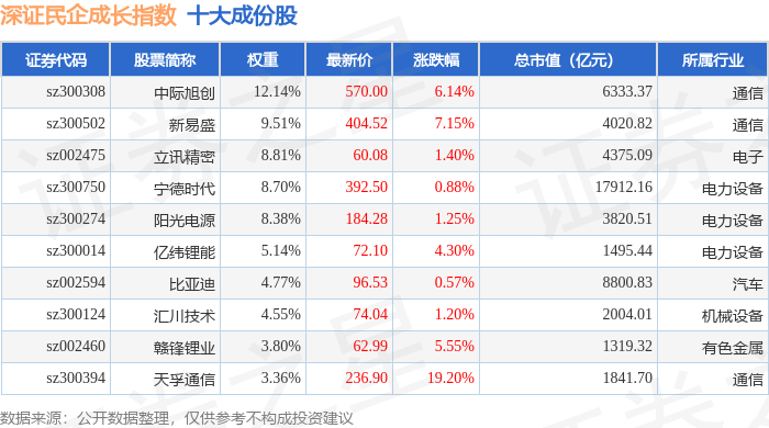 证券之星消息,12月8日,深证民企成长(970071)指数报收于4021.26点,涨3.81%,成交1334.95亿元,换手率2.42%。当日该指数成份股中,上涨的有40家,天孚通信以19.2%的涨幅领涨,下跌的有10家,川恒股份以2.15%的跌幅领跌。