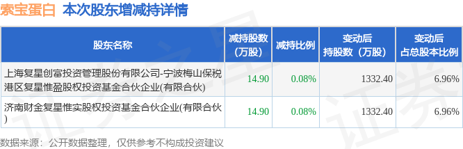 证券之星消息,12月8日索宝蛋白发布公告《索宝蛋白:关于持股5%以上股东权益变动触及1%刻度的提示性公告》,其股东上海复星创富投资管理股份有限公司-宁波梅山保税港区复星惟盈股权投资基金合伙企业(有限合伙)、济南财金复星惟实股权投资基金合伙企业(有限合伙)于2025年12月4日至2025年12月5日间合计减持29.8万股,占公司目前总股本的0.1556%,变动期间该股股价下跌1.57%,截止12月5日收盘报19.42元。
