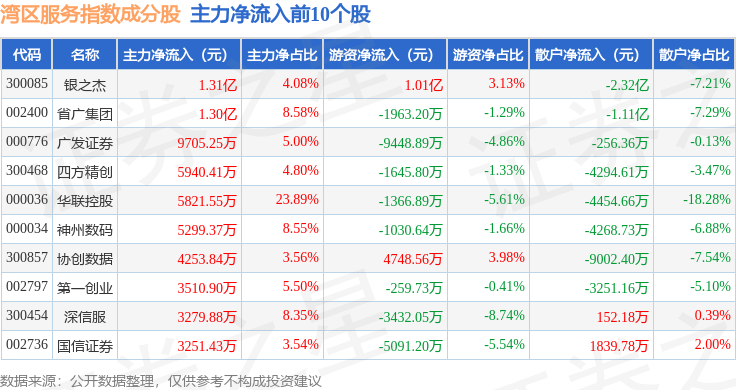 资金流向方面,湾区服务(980011)指数成份股当日主力资金净流入合计3.59亿元,游资资金净流出合计2.07亿元,散户资金净流出合计1.52亿元。成份股资金流向详情见下表: