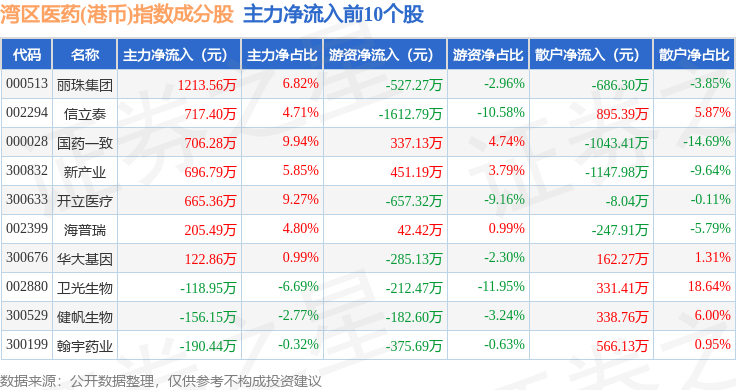 资金流向方面,湾区医药(港币)(980014)指数成份股当日主力资金净流出合计4.08亿元,游资资金净流入合计473.34万元,散户资金净流入合计4.03亿元。成份股资金流向详情见下表: