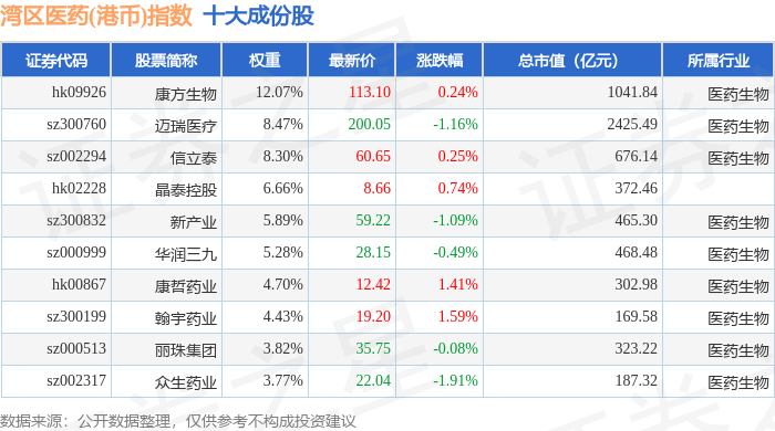 湾区医药(港币)(980014)指数十大成份股详情如下: