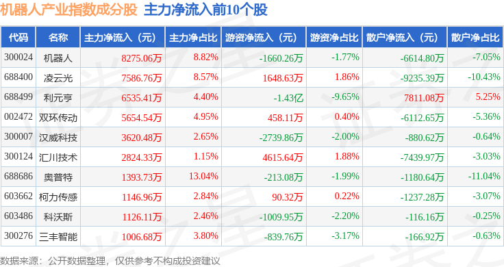 资金流向方面,机器人产业(980022)指数成份股当日主力资金净流出合计5.73亿元,游资资金净流入合计1.06亿元,散户资金净流入合计4.68亿元。成份股资金流向详情见下表:
