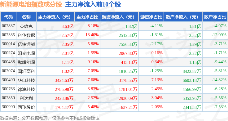 资金流向方面,新能源电池(980027)指数成份股当日主力资金净流入合计7.46亿元,游资资金净流出合计6663.95万元,散户资金净流出合计6.79亿元。成份股资金流向详情见下表: