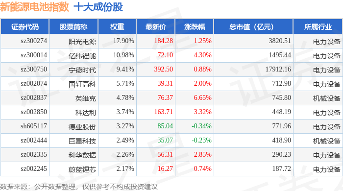 证券之星消息,12月8日,新能源电池(980027)指数报收于3393.09点,涨1.74%,成交497.18亿元,换手率2.02%。当日该指数成份股中,上涨的有36家,英维克以6.65%的涨幅领涨,下跌的有12家,青鸟消防以1.83%的跌幅领跌。