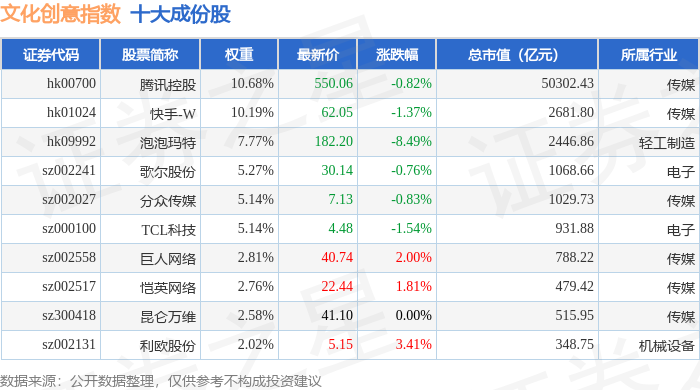 文化创意(980046)指数十大成份股详情如下: