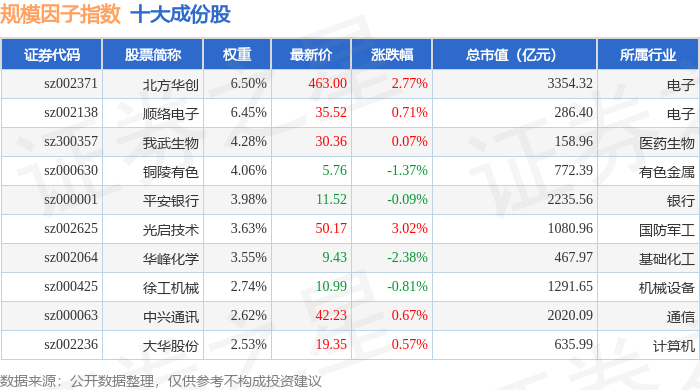 证券之星消息,12月8日,规模因子(980055)指数报收于1972.37点,涨1.24%,成交564.93亿元,换手率1.69%。当日该指数成份股中,上涨的有34家,迈为股份以17.47%的涨幅领涨,下跌的有16家,华峰化学以2.38%的跌幅领跌。
