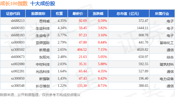 证券之星消息,12月8日,成长100(980080)指数报收于9510.47点,涨3.82%,成交1424.85亿元,换手率2.59%。当日该指数成份股中,上涨的有74家,瑞可达以20.0%的涨幅领涨,下跌的有25家,润丰股份以3.49%的跌幅领跌。