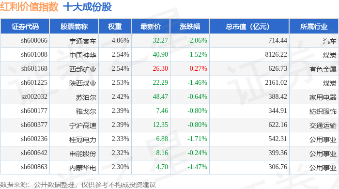 红利价值(980103)指数十大成份股详情如下:
