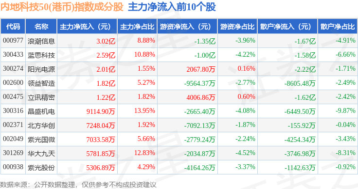 资金流向方面,内地科技50(港币)(983004)指数成份股当日主力资金净流出合计2.54亿元,游资资金净流出合计5461.73万元,散户资金净流入合计3.09亿元。成份股资金流向详情见下表: