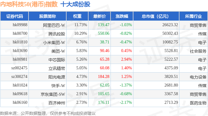 内地科技50(港币)(983004)指数十大成份股详情如下: