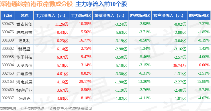 资金流向方面,深港通综指(港币)(983006)指数成份股当日主力资金净流入合计28.88亿元,游资资金净流出合计42.06亿元,散户资金净流入合计13.18亿元。成份股资金流向详情见下表:
