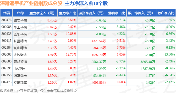 资金流向方面,深港通手机产业链(983009)指数成份股当日主力资金净流入合计16.87亿元,游资资金净流出合计6.3亿元,散户资金净流出合计10.57亿元。成份股资金流向详情见下表: