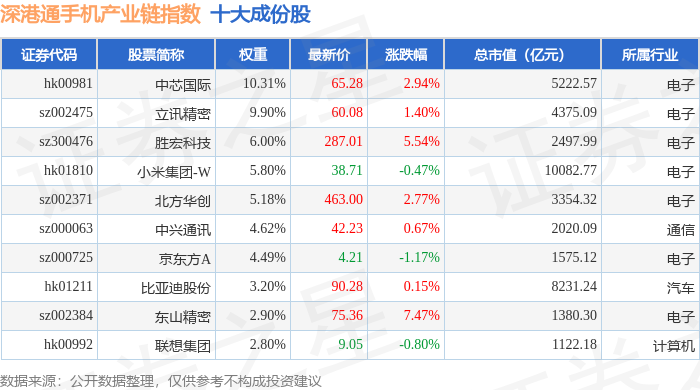 深港通手机产业链(983009)指数十大成份股详情如下: