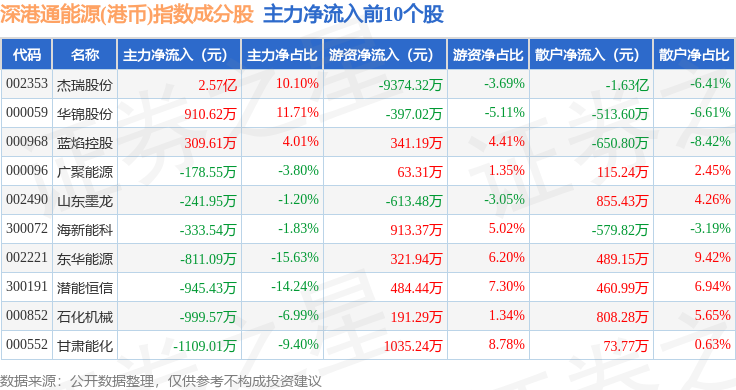 资金流向方面,深港通能源(港币)(983014)指数成份股当日主力资金净流入合计1.46亿元,游资资金净流出合计4146.64万元,散户资金净流出合计1.04亿元。成份股资金流向详情见下表: