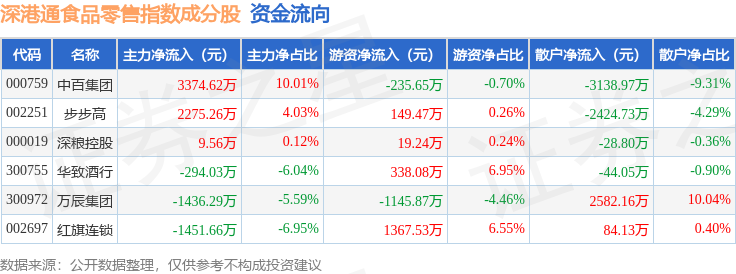 资金流向方面,深港通食品零售(983037)指数成份股当日主力资金净流入合计2477.46万元,游资资金净流入合计492.8万元,散户资金净流出合计2970.26万元。成份股资金流向详情见下表: