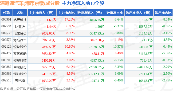 资金流向方面,深港通汽车(港币)(983040)指数成份股当日主力资金净流入合计1.23亿元,游资资金净流出合计4.2亿元,散户资金净流入合计2.97亿元。成份股资金流向详情见下表: