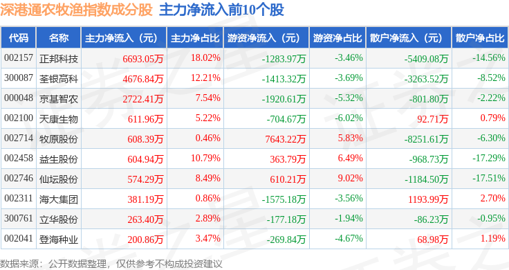 资金流向方面,深港通农牧渔(983051)指数成份股当日主力资金净流出合计5412.58万元,游资资金净流入合计1.33亿元,散户资金净流出合计7935.27万元。成份股资金流向详情见下表: