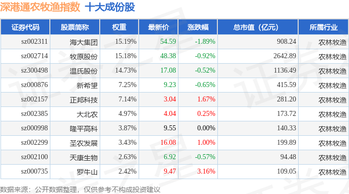 深港通农牧渔(983051)指数十大成份股详情如下: