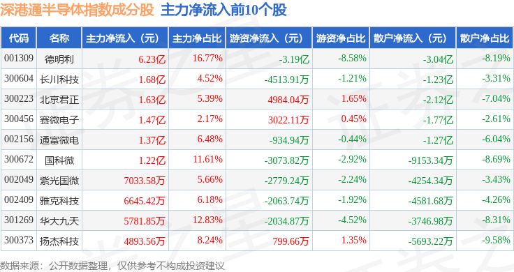 资金流向方面,深港通半导体(983067)指数成份股当日主力资金净流入合计13.06亿元,游资资金净流出合计3.66亿元,散户资金净流出合计9.4亿元。成份股资金流向详情见下表: