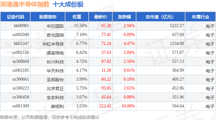 证券之星消息,12月8日,深港通半导体(983067)指数报收于14219.36点,涨2.61%,成交417.11亿元,换手率3.4%。当日该指数成份股中,上涨的有35家,赛微电子以11.35%的涨幅领涨,下跌的有4家,航宇微以2.63%的跌幅领跌。