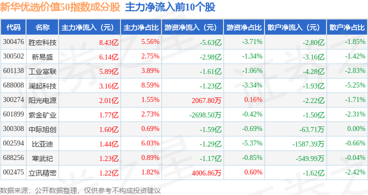 资金流向方面,新华优选价值50(989004)指数成份股当日主力资金净流出合计6.0亿元,游资资金净流出合计1.14亿元,散户资金净流入合计7.14亿元。成份股资金流向详情见下表: