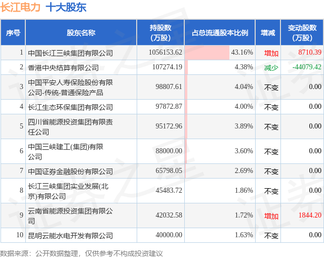 根据长江电力2025年三季报公布的十大股东详情如下: