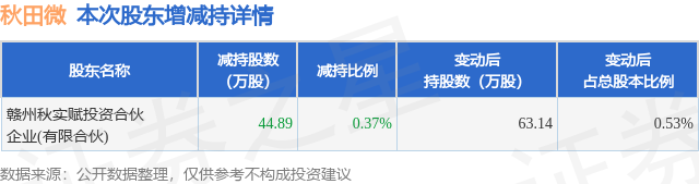 证券之星消息,12月8日秋田微发布公告《秋田微:关于特定股东及职工代表董事、高级管理人员股份减持计划实施完毕的公告》,其股东赣州秋实赋投资合伙企业(有限合伙)于2025年11月18日至2025年12月8日间合计减持44.89万股,占公司目前总股本的0.3741%,变动期间该股股价上涨10.12%,截止12月8日收盘报35.37元。