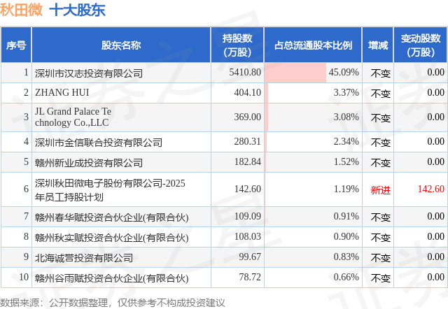 根据秋田微2025年三季报公布的十大股东详情如下: