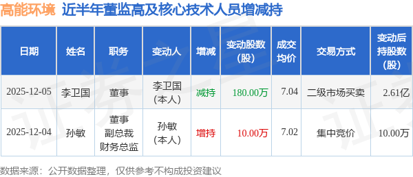 证券之星消息,根据12月8日市场公开信息、上市公司公告及交易所披露数据整理,高能环境(603588)最新董监高及相关人员股份变动情况:2025年12月5日公司董事李卫国共减持公司股份180.0万股,占公司总股本为0.1182%。变动期间公司股价上涨2.42%,12月5日当日收盘报7.2元。