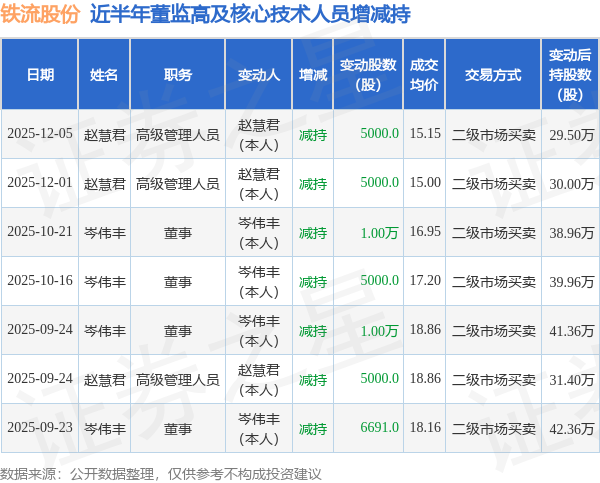 铁流股份近半年内的董监高及核心技术人员增减持详情如下: