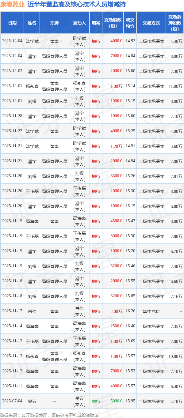 证券之星消息,根据12月8日市场公开信息、上市公司公告及交易所披露数据整理,康缘药业(600557)最新董监高及相关人员股份变动情况:2025年12月4日公司高级管理人员潘宇、董事陈学斌共增持公司股份1.1万股,占公司总股本为0.0019%。变动期间公司股价下跌0.2%,12月4日当日收盘报15.1元。