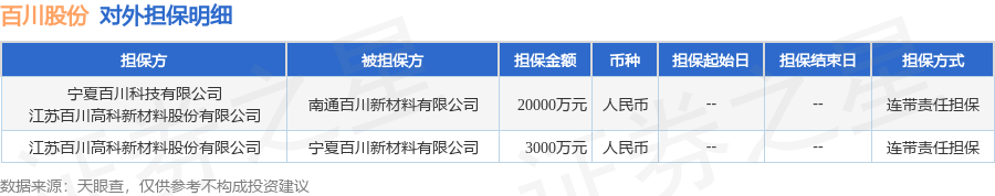 百川股份12月5日披露2笔对外担保,被担保公司2家。对外担保明细如下表: