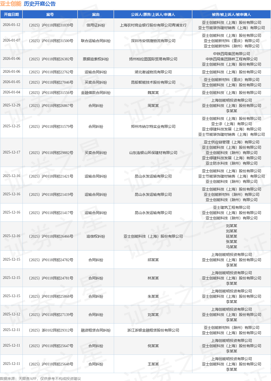 案号:(2025)浙0102民初29312号根据统计,近一年内以亚士创能科技(上海)股份有限公司为当事人的历史开庭公告有156则,其中案由为“买卖合同纠纷”的公告以40则居首,其次为“合同纠纷”有33则,“运输合同纠纷”有27则。历史开庭公告(前20条)如下:
