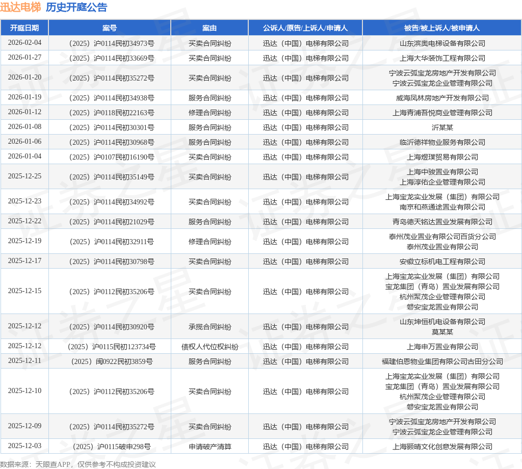 案号:(2025)闽0922民初3859号根据统计,近一年内以迅达(中国)电梯有限公司为当事人的历史开庭公告有237则,其中案由为“买卖合同纠纷”的公告以147则居首,其次为“承揽合同纠纷”有30则,“修理合同纠纷”有18则。历史开庭公告(前20条)如下: