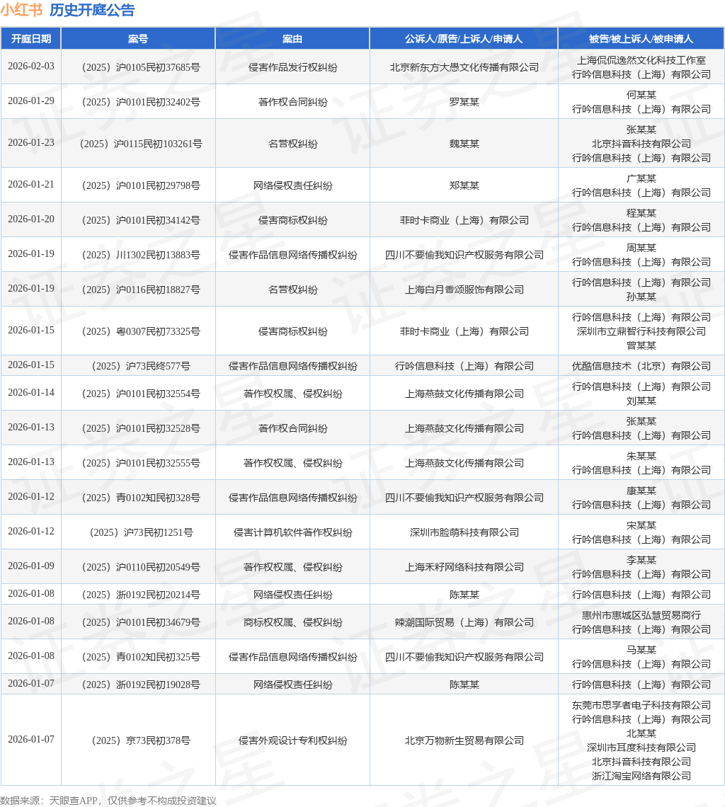 案号:(2025)沪0101民初16769号根据统计,近一年内以行吟信息科技(上海)有限公司为当事人的历史开庭公告有1184则,其中案由为“网络侵权责任纠纷”的公告以464则居首,其次为“网络服务合同纠纷”有226则,“名誉权纠纷”有109则。历史开庭公告(前20条)如下: