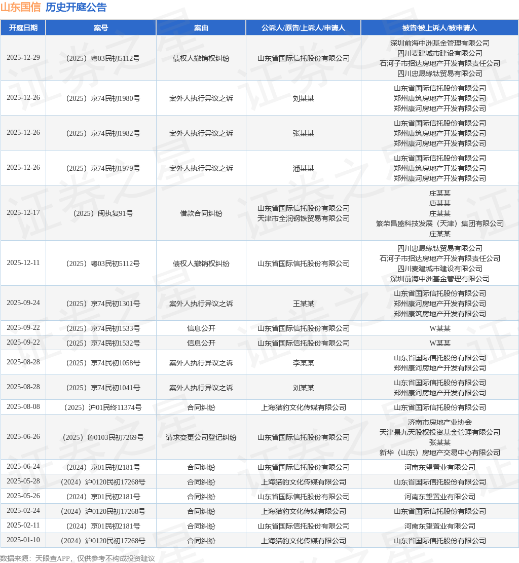 案号:(2025)粤03民初5112号根据统计,近一年内以山东省国际信托股份有限公司为当事人的历史开庭公告有19则,其中案由为“合同纠纷”的公告以7则居首,其次为“案外人执行异议之诉”有6则,“信息公开”有2则。历史开庭公告如下: