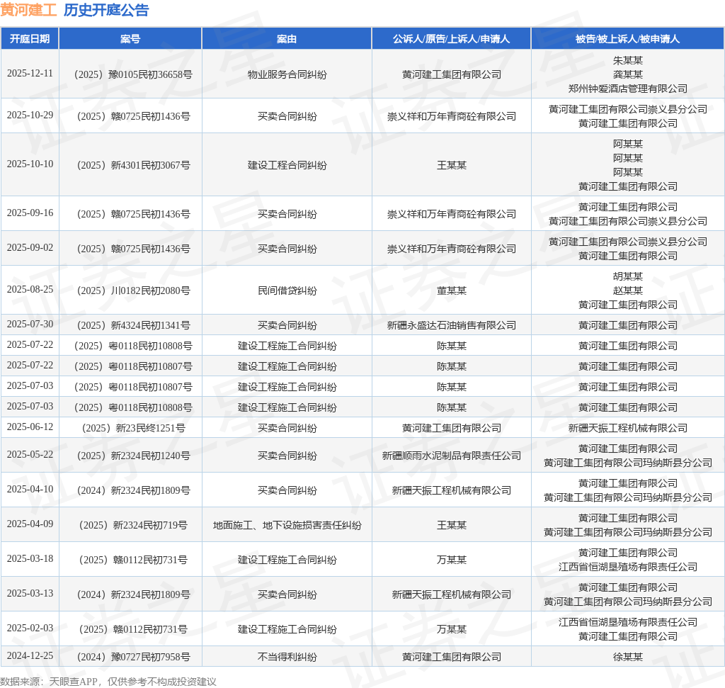 案号:(2025)豫0105民初36658号根据统计,近一年内以黄河建工集团有限公司为当事人的历史开庭公告有19则,其中案由为“买卖合同纠纷”的公告以8则居首,其次为“建设工程施工合同纠纷”有6则,“不当得利纠纷”有1则。历史开庭公告如下: