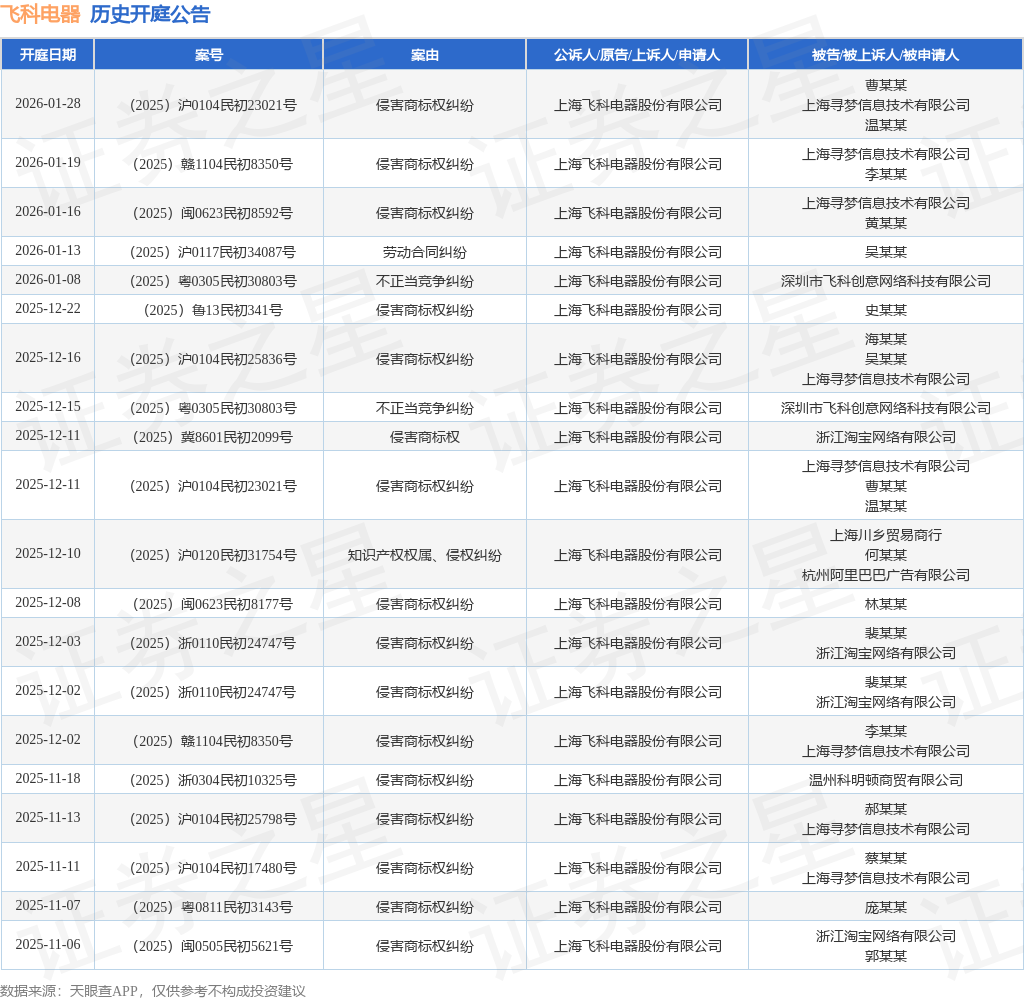 案号:(2025)冀8601民初2099号根据统计,近一年内以上海飞科电器股份有限公司为当事人的历史开庭公告有252则,其中案由为“侵害商标权纠纷”的公告以198则居首,其次为“不正当竞争纠纷”有16则,“侵害外观设计专利权纠纷”有9则。历史开庭公告(前20条)如下: