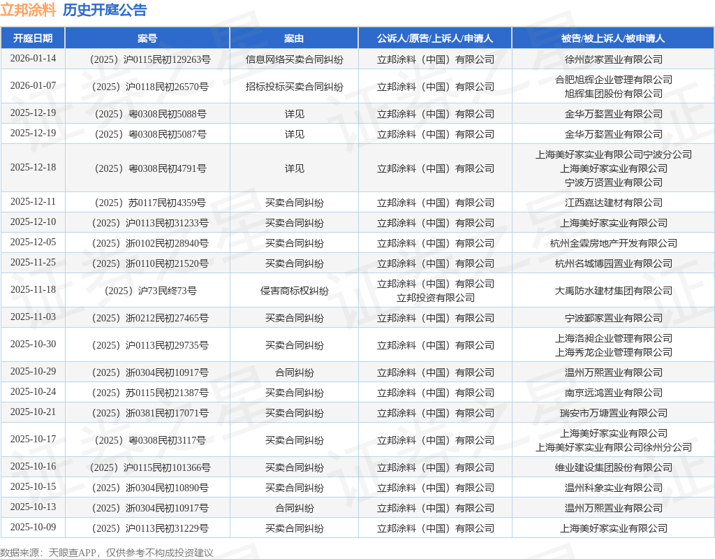 案号:(2025)苏0117民初4359号根据统计,近一年内以立邦涂料(中国)有限公司为当事人的历史开庭公告有89则,其中案由为“买卖合同纠纷”的公告以66则居首,其次为“不正当竞争纠纷”有6则,“侵害商标权纠纷”有3则。历史开庭公告(前20条)如下: