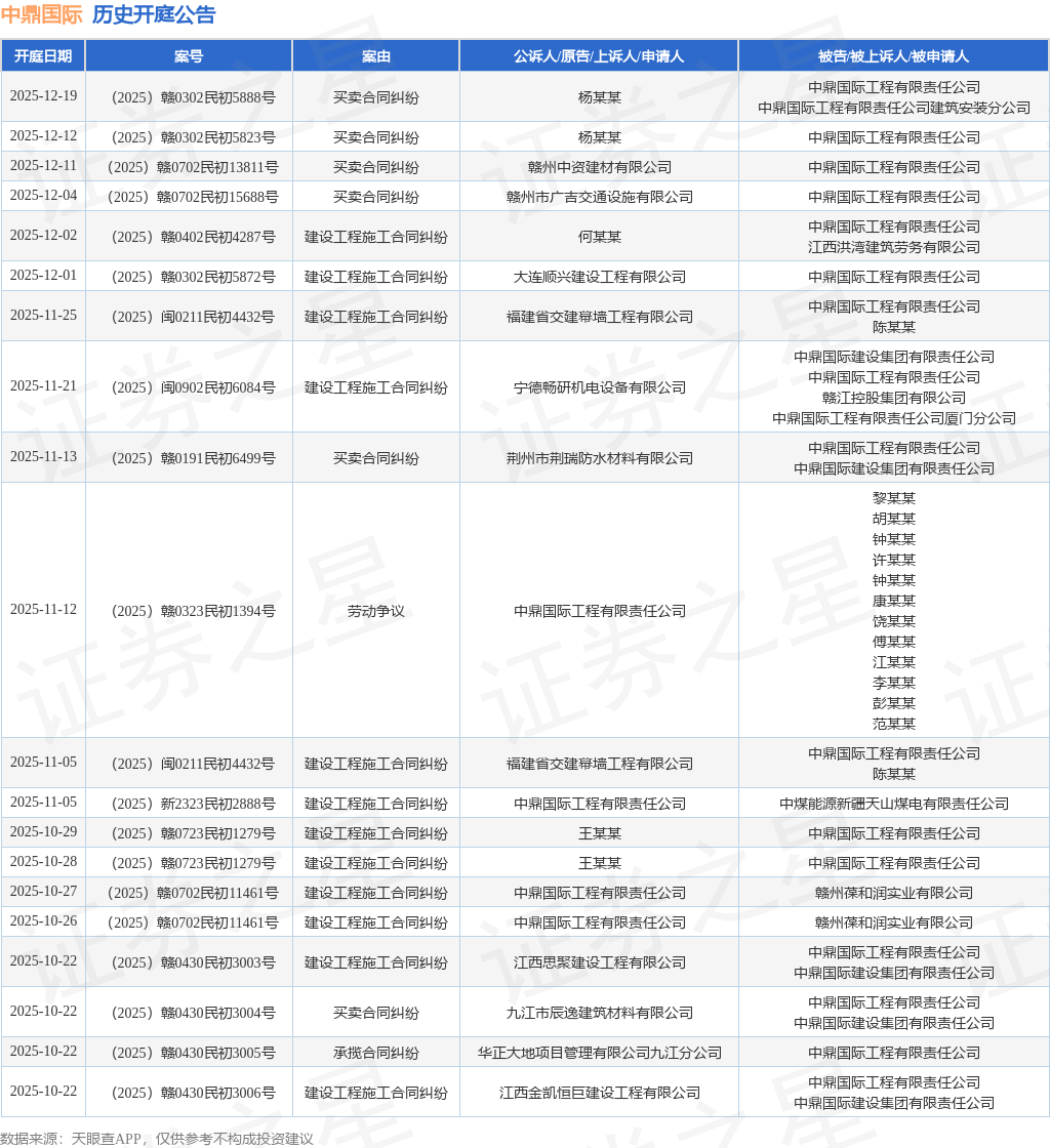 案号:(2025)赣0702民初13811号根据统计,近一年内以中鼎国际工程有限责任公司为当事人的历史开庭公告有117则,其中案由为“建设工程施工合同纠纷”的公告以28则居首,其次为“买卖合同纠纷”有26则,“劳务合同纠纷”有24则。历史开庭公告(前20条)如下: