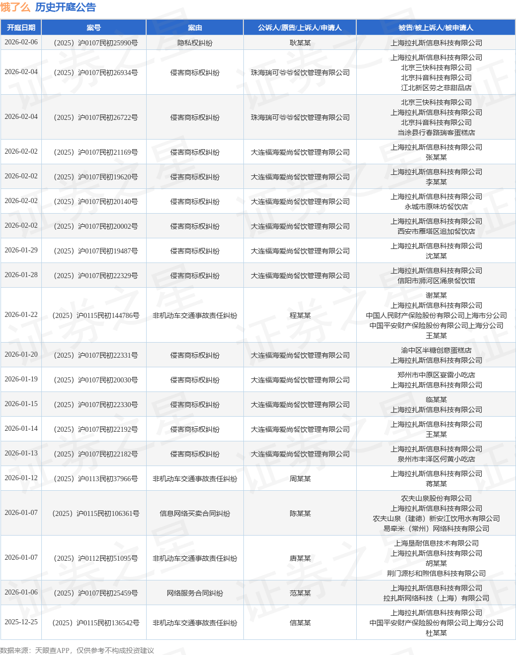 案号:(2025)沪0107民初30354号根据统计,近一年内以上海拉扎斯信息科技有限公司为当事人的历史开庭公告有439则,其中案由为“非机动车交通事故责任纠纷”的公告以230则居首,其次为“侵害商标权纠纷”有71则,“机动车交通事故责任纠纷”有46则。历史开庭公告(前20条)如下: